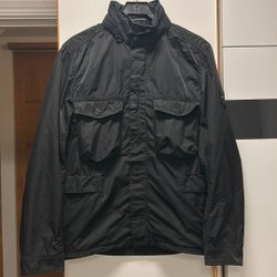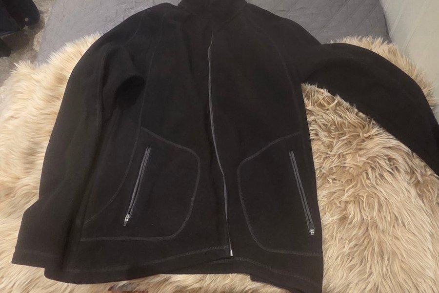 Svart jacka med dragkedja framtill och två fickor med dragkedja. Jackan har en hög krage.