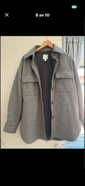 En grå jacka med knappar framtill och två bröstfickor med lock. Jackan har en klassisk krage och långa ärmar med manschetter. Passformen är avslappnad och rak.