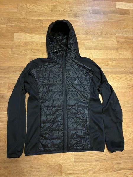 Svart jacka med huva och dragkedja framtill. Jackan har vadderade partier på framsidan och huvan, samt slätare tyg på ärmar och sidor. Det finns en liten logotyp på bröstet.