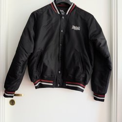 Svart jacka med dragkedja och två fickor framtill. Jackan har en mjuk krage och ett emblem på bröstet. Insidan är fodrad med ett mjukt, fluffigt material.
