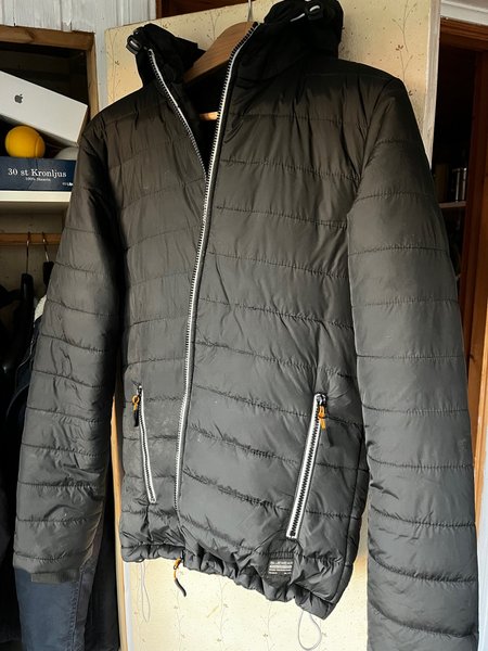 Svart vadderad jacka med dragkedja framtill och två fickor med dragkedja. Jackan har en huva och justerbara dragskor i nederkant.