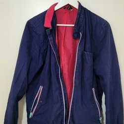 En blå jacka med mörk blå detalj på armarna. Jackan har en huva med dragsko och en dragkedja framtill. Den har även två fickor med dragkedja på sidorna.