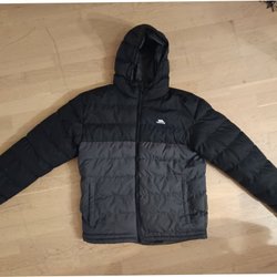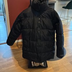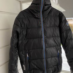 Blå dunjacka med huva och fickor framtill. Jackan har knappar fram och en broderad logotyp på bröstet. Riktigt tjock och varm. Behöver ev en tvätt.