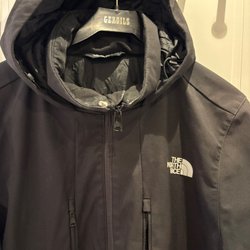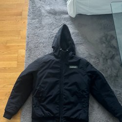Svart jacka med huva och dragkedja. Jackan har flera fickor framtill och en logotyp på ärmen. Varm ps saknas skärp