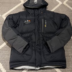 Svart jacka med dragkedja framtill och två fickor med dragkedja på bröstet. Jackan har en huva och Sail Racing logotyp tryckt på bröstet. Vinterjacka