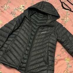 Peak Performance dunjacka med huva och dragkedja framtill. Innerfickor och extra innerficka med dragkedja. Sidofickor med dragkedja. Väldigt fint skick!