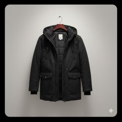 Svart vinterjacka med dragkedja och huva. Jackan har en broderad logotyp på bröstet.