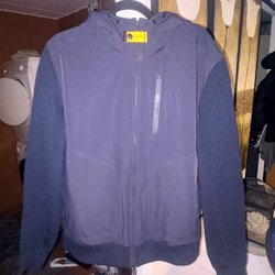 Marinblå vadderad dunjacka med dragkedja och knappar fram. Jackan har flera fickor med dragkedja och tryckknappar. Luvan har en avtagbar fuskpäls. Nästan inte använd.