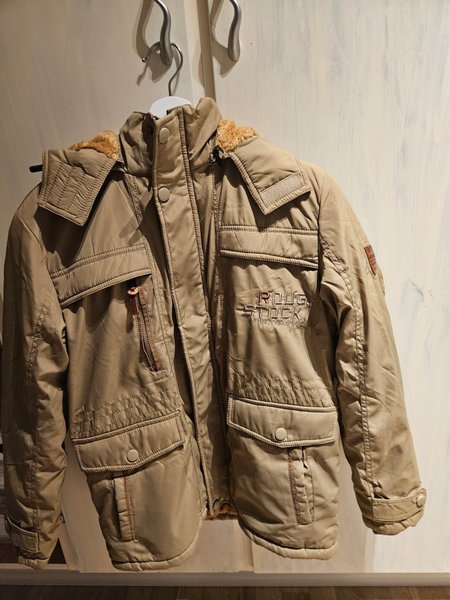 En beige jacka med flera fickor, dragkedja och knappar framtill. Jackan har en krage med fuskpälsdetaljer och justerbara ärmslut.