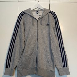 Svart Adidas jacka med dragkedja och vita ränder på ärmarna. Adidas loggan finns på bröstet.