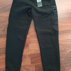 Snygga svarta träningsbyxor med coola grafiska detaljer. Byxorna har tryck med siffror och bokstäver på benen. De har en bekväm passform och är perfekta för träning eller vardagsbruk.