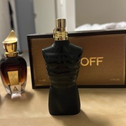 Ett par svarta träningsbyxor med orange detaljer och GASP INC tryckt längs benet. Endast testade, så de är så gott som nya