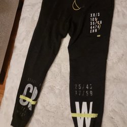 Ett par svarta träningsbyxor med resår i midjan och dragsko. Byxorna har en ficka med dragkedja på sidan med texten "INEW SPOR" tryckt på dragkedjan.