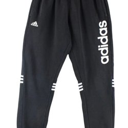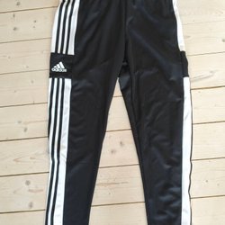 Svarta adidas träningsbyxor med tre vita ränder nedför benen och en vit Adidas logga på vänster lår. Byxorna har resår och dragsko i midjan samt dragkedja nedtill på benen. Obs! Det finns hål på båda byxbenen, se bilder för att bedöma skick!