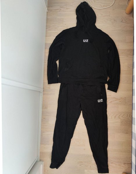 Svart EA7 träningsset med en huvtröja och ett par byxor.