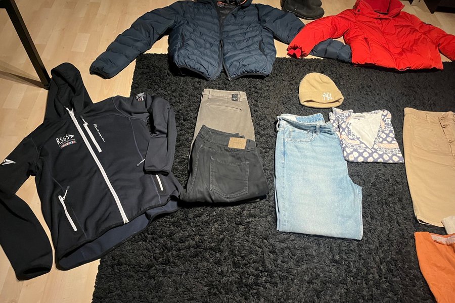 Denna annons inkluderar en marin huvtröja , en mörkblå pufferjacka, beige mössa, ett par ljusblå loose jeans HM, ett par svarta Cavaliere jeans, ett par bruna Replay chinos