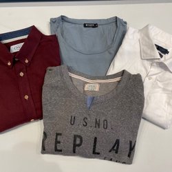 Klädpaket som består av T-shirt , piké kortärmad tröja, två långärmade tröjor och ett par beige byxor. En vit skjorta .