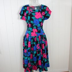 Fin klänning med blommor i bomull. Knäppning hela vägen fram. Skärpet hör ej till. Dolda fickor i sidorna. Bra skick. Konfektionssydd men saknar etiketter.