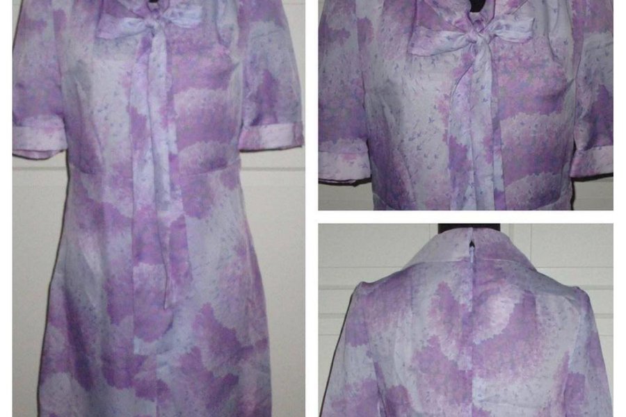 Fin klänning i lila toner. Knytband vid byst. Lappen är blekt så jag kan bara urskilja storlek 40. Tunn polyester, fodrad. Dragkedja i ryggen. Bra skick.