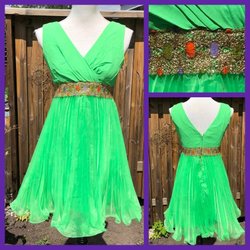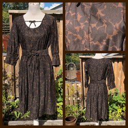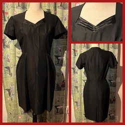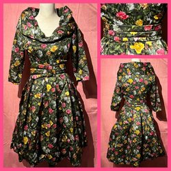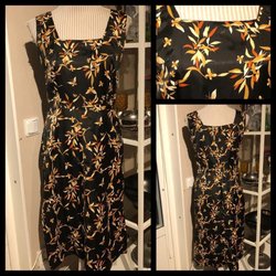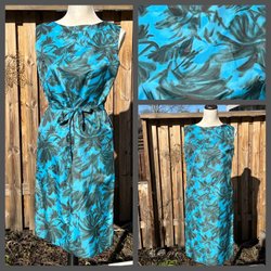 Vacker klänning 60-tal från Bianchini. Dragkedja i ryggen. Band på ryggen som ligger omlott och fästs med tryckknappar. Markerande band vid midja. Vackert glansigt tyg utan stretch. Mycket fint skick.
