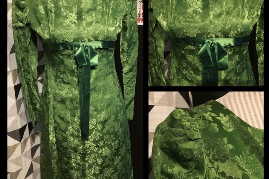 Mycket fin hemsydd klänning i glansigt mossgrönt tyg. Metalldragkedja bak. Satinband runtom. Liten puff vid axel. Bra skick!