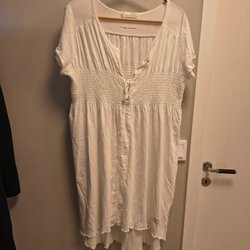 Klänningen har långa ärmar och smock.
