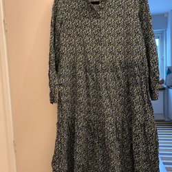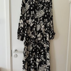 Långärmad klänning med ett mönster i blått, svart och brunt. Klänningen har knappar framtill och ett knytband i midjan för att framhäva figuren.