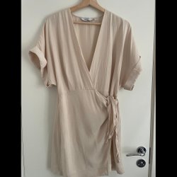 Säljer denna fina klänning i en mjuk, satinliknande beige färg. Modellen har en snygg omlott-topp och 3/4-ärmar som ger en avslappnad men elegant look. Kjoldelen har justerbara rynkade sidor med dragsko, vilket gör att du själv kan anpassa längden och stilen.
