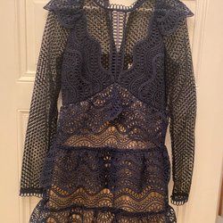 Elegant, ljusrosa klänning med långa, utsvängda ärmar och dekorativa detaljer runt halsen och midjan. Klänningen har en ribbad struktur och en utsvängd kjol. Uppskattar storleken till s/xs