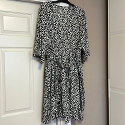 Elegant omlottklänning med långa ärmar och ett knytband i midjan. Klänningen har ett stilrent svartvitt randigt mönster och en asymmetrisk fåll som ger en modern touch. Tyget skrynklar sig inte, storleken är cirka 38