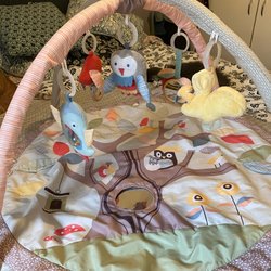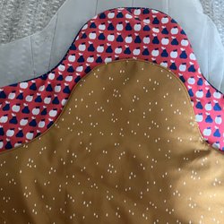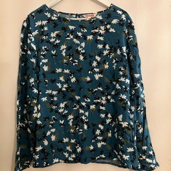 Blå klänning med ett blommigt mönster, smock över hela klänningen och volang nedtill. Puffärmar med resår. Finns katt i hemmet.