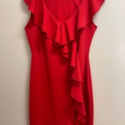 En röd klänning med en asymmetrisk design. Klänningen har en rund halsringning och är utan ärmar. Den har en smal passform och är tillverkad i ett mjukt och stretchigt material.