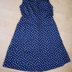 Blå klänning med blommigt mönster i rött, gult och vitt. Klänningen har en krage och knappar framtill. Det finns ett band i midjan som kan knytas bakom ryggen.