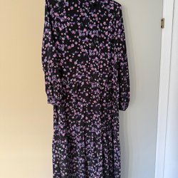 Svart klänning med ett färgglatt mönster. Klänningen har en v-ringning och ett svart band i midjan som kan knytas baktill. Den har ett tunt tylltyg som ger en fin volym till kjolen. Det köpt o Spanien det va årets mode. Lite strejk och passa storlek 38-40 aldrig använd helt ny med prislappen på.