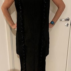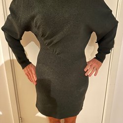 Svart stickad klänning från Self-Portrait med långa ärmar och dekorativa utskärningar runt halsen. Klänningen har en figurnära passform och en längd som slutar ovanför knäet. Storlek L, men passar mer M