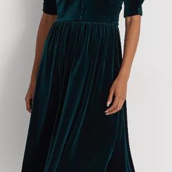 Klänning i en vacker grön nyans med v-ringning med dolda knappar och korta, böljande ärmar. Klänningen har en smickrande passform med resår i midjan och ett matchande band.