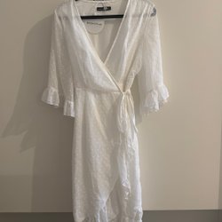Vit klänning med v-ringning och knytband framtill. Klänningen har korta ärmar med volang och en volangkjol.