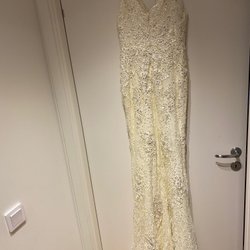 Elegant klänning i en vacker rosa nyans. Klänningen har en v-ringning och puffärmar. Den har en knutdetalj framtill och en slits på sidan. Strlk 38 oanvänd