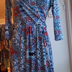 Ärmlös klänning med ett unikt cirkelmönster i marinblått och vitt. Klänningen och har en v-ringning och knappar och en avslappnad passform.