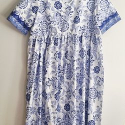 Kjole med blomsterprint. Kjolen har en tætsiddende overdel og et skørt, der går ud fra taljen.