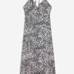 Vit klänning med v-ringning och korta ärmar. Klänningen har en plisserad design och knappar framtill. Slitsar på sidorna nertill