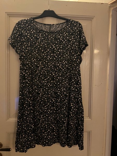 Söt klänning med ett blommigt mönster i svart och vitt. Klänningen har korta ärmar och en rund halsringning. Den har en avslappnad passform.