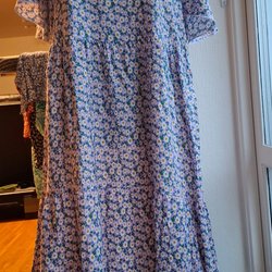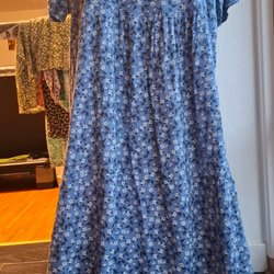 Blå klänning med ett blommigt mönster i vitt. Klänningen har en v-ringning och korta, volangärmar. Den har en resår i midjan och ett avtagbart band.