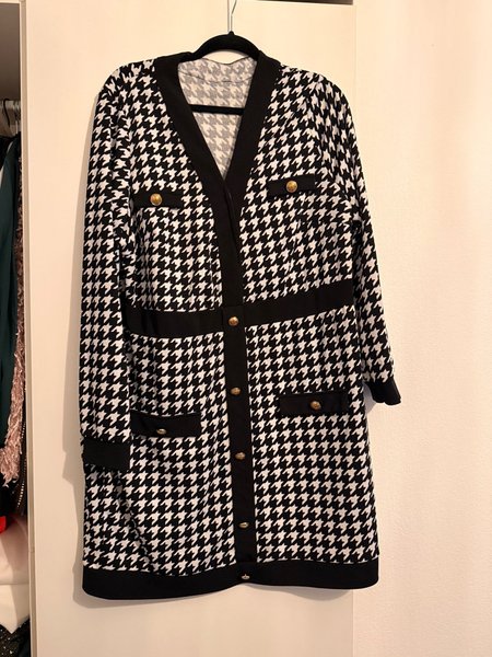 Svart och vit klänning med hundtandsmönster, v-ringning, långa ärmar och guldknappar. Klänningen har fickor fram.