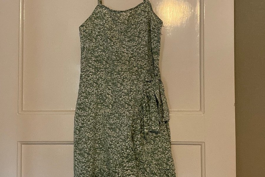 Grön klänning med blommigt mönster och smala axelband. Klänningen har en omlottdesign med en liten volangdetalj i sidan.