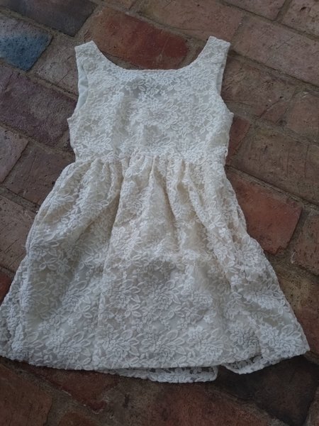 Vit klänning med spetsmönster. Klänningen är ärmlös och har en markerad midja med en utställd kjol.