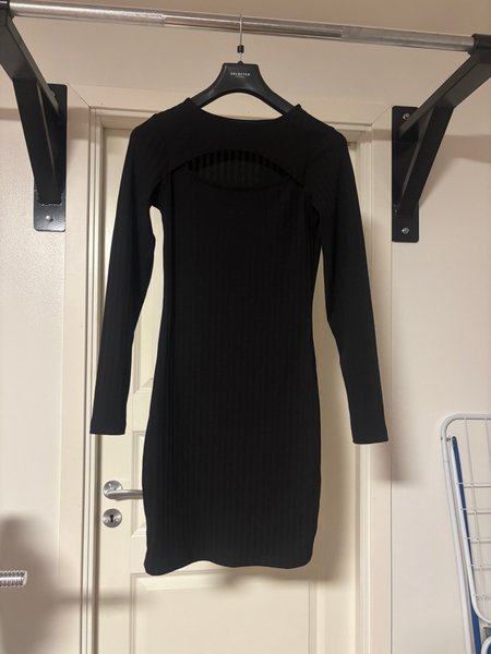 Svart klänning med lång ärm och en utskärning framtill. Klänningen har en ribbad textur.
