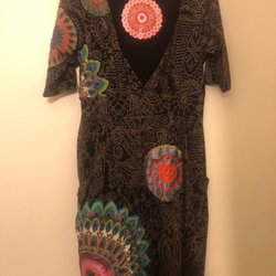 Färgglad klänning från Desigual med långa ärmar. Klänningen har ett unikt mönster i rött och svart.