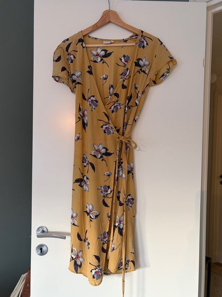 Omlottklänning i senapsgul färg med blommigt mönster. Klänningen har korta ärmar och knyts i midjan. Storlek S
