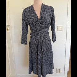Blå klänning med ett vackert mönster. Klänningen har en omlottdesign och korta ärmar. Figurnära modell.